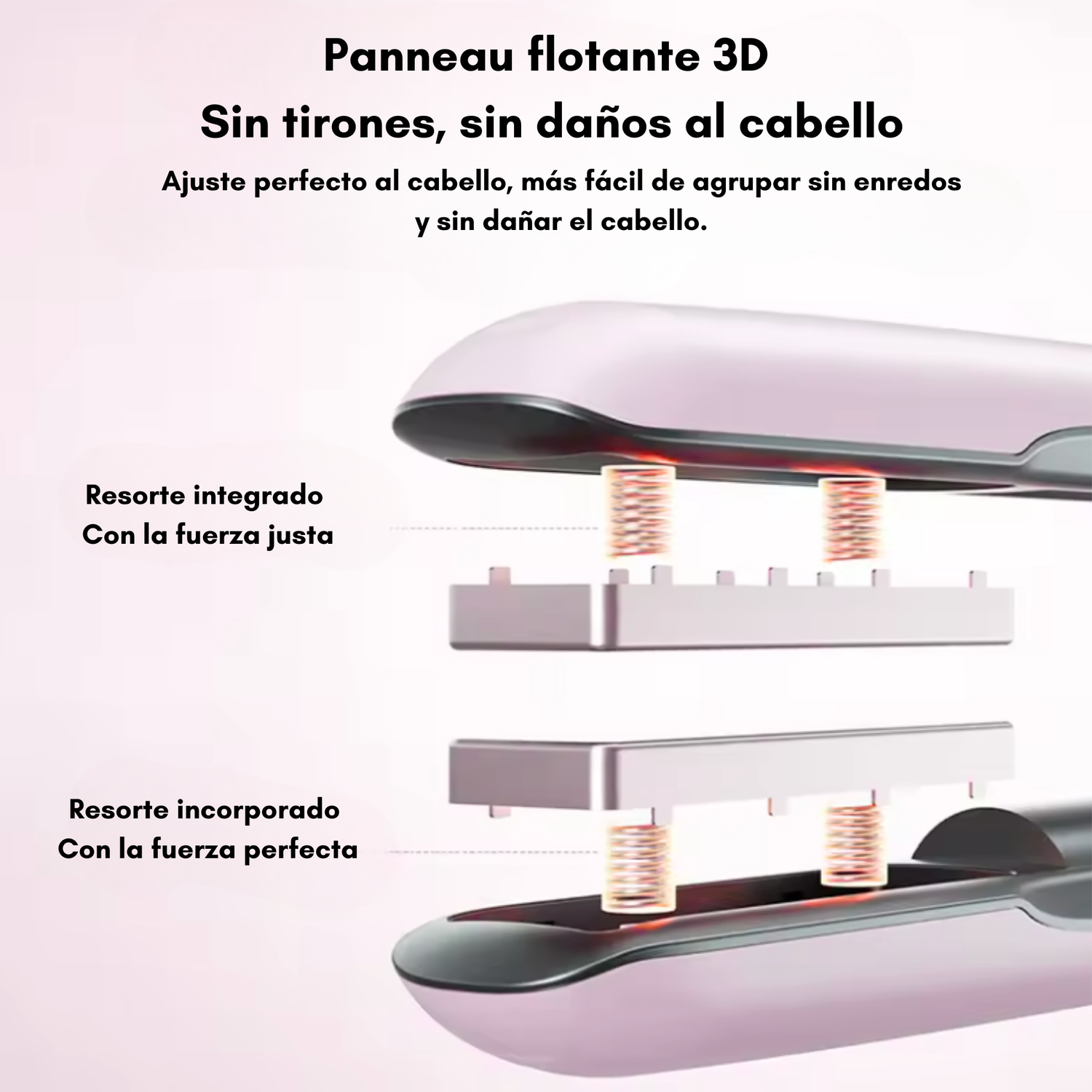 El resorte integrado ofrece la fuerza justa para alisar o rizar tu cabello con total control, sin esfuerzo y sin romper la fibra capilar.